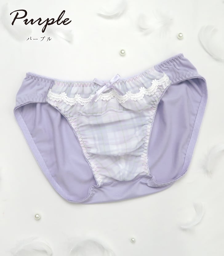 ナチュラルで可愛らしいチェック柄が魅力のショーツ。レースのディテールと小さなリボンがかわいらしさを引き立てます。ソフトなフィット感で快適な着心地を実現。柔らかく甘い印象のオレンジと爽やかなパープルの2色展開。デイリー使いにぴったりな、カジュアルでキュートなデザインです。初めてのメンズショーツに挑戦したい、そんな方にもおすすめ♪お揃いのブラもお見逃しなく!