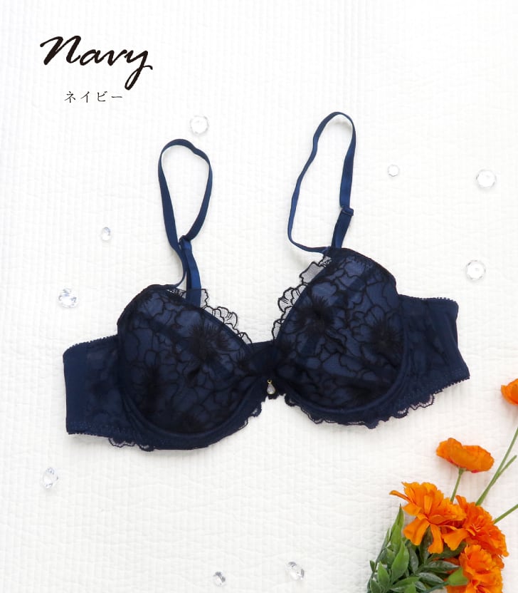 シアーのフラワー刺繍レースを纏った爽やかなデザイン。レースの透け感と刺繍部分のパキッと感で程よくコントラストが出て、お洒落な印象のランジェリー♪カラーは爽やかで明るい印象を与える「オレンジ」と落ち着いた大人っぽい印象を与える「ネイビー」の2色展開◎