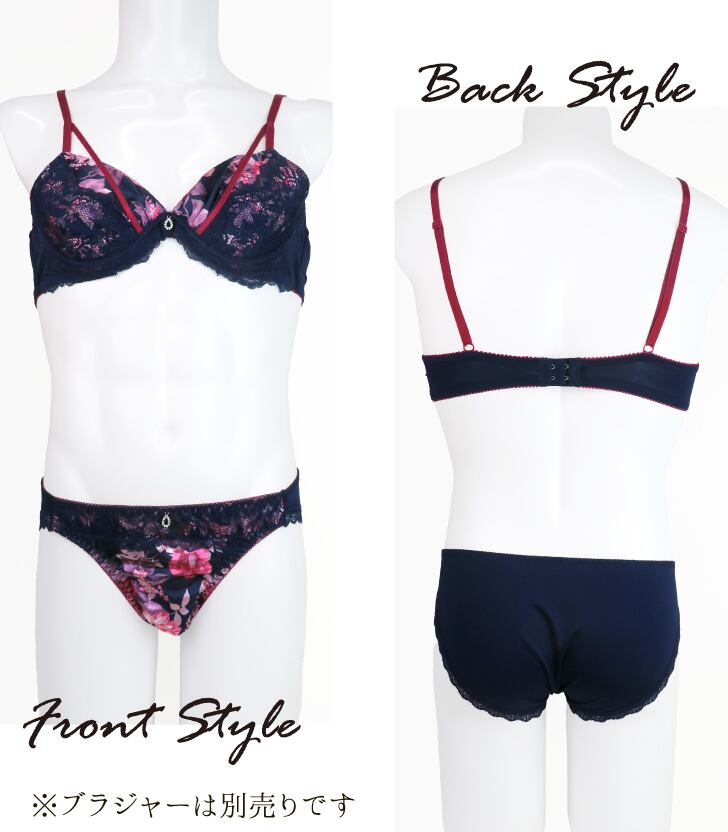 鮮やかに咲き誇るフラワープリントをラッピングするように重ねたレースがエレガントなデザイン。キラキラと煌めくチャームと足口のレースで可愛さをプラスしました♪カラーは「ホワイト」と「ネイビー」の2色展開。初めてメンズランジェリーに挑戦する方にもオススメの一着です◎是非一度お試し下さい!
