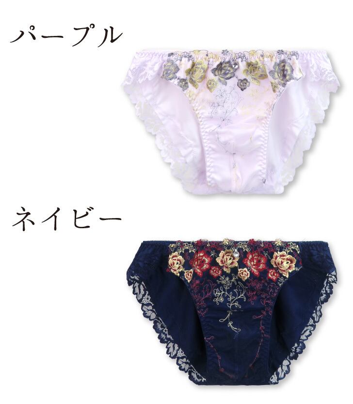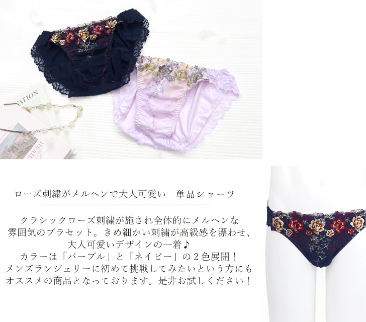 クラシックローズ刺繍が施され全体的にメルヘンな雰囲気のブラセット。きめ細かい刺繍が高級感を漂わせ、大人可愛いデザインの一着♪カラーは「パープル」と「ネイビー」の2色展開!メンズランジェリーに初めて挑戦してみたいという方にもオススメの商品となっております。是非お試しください!