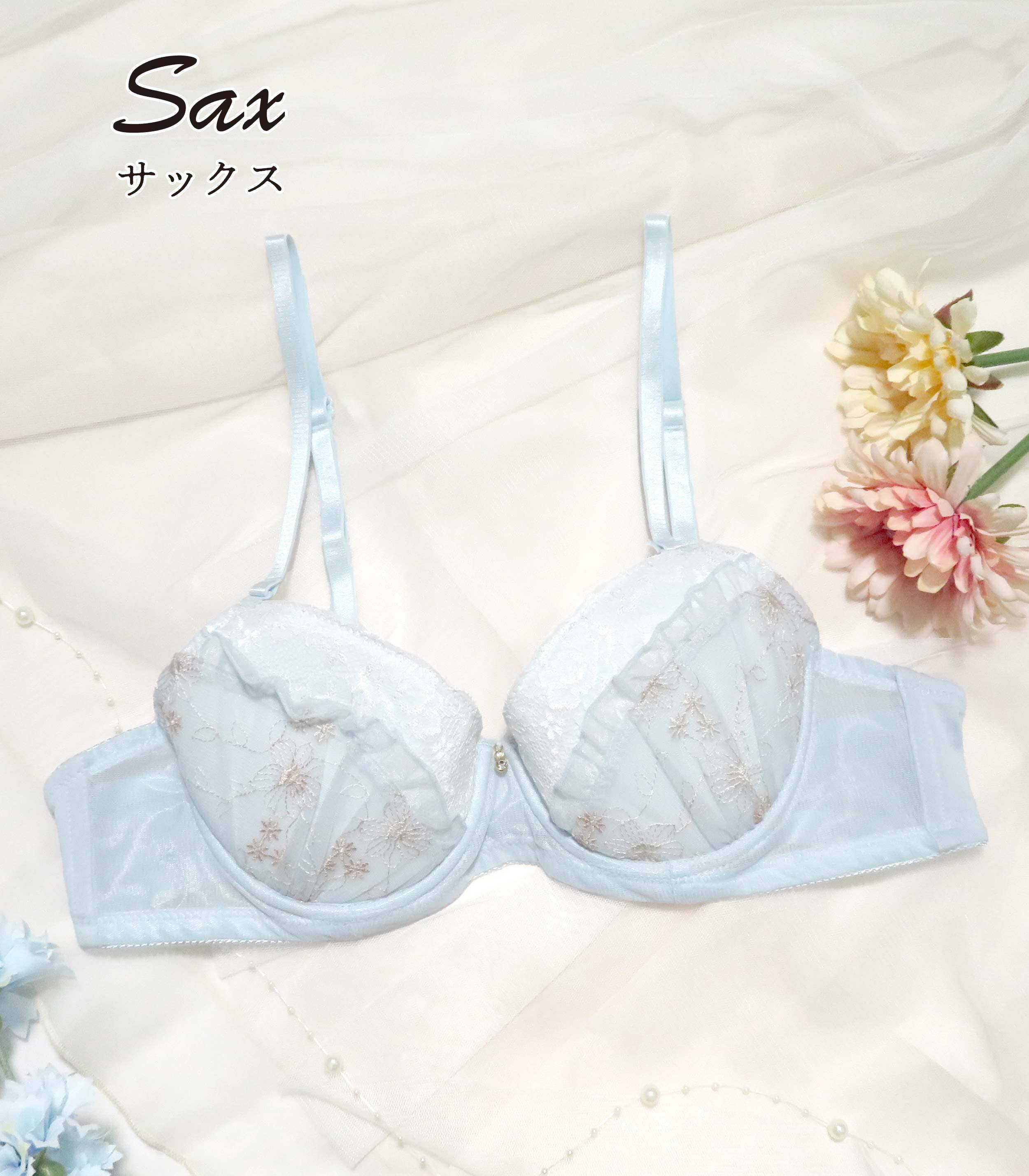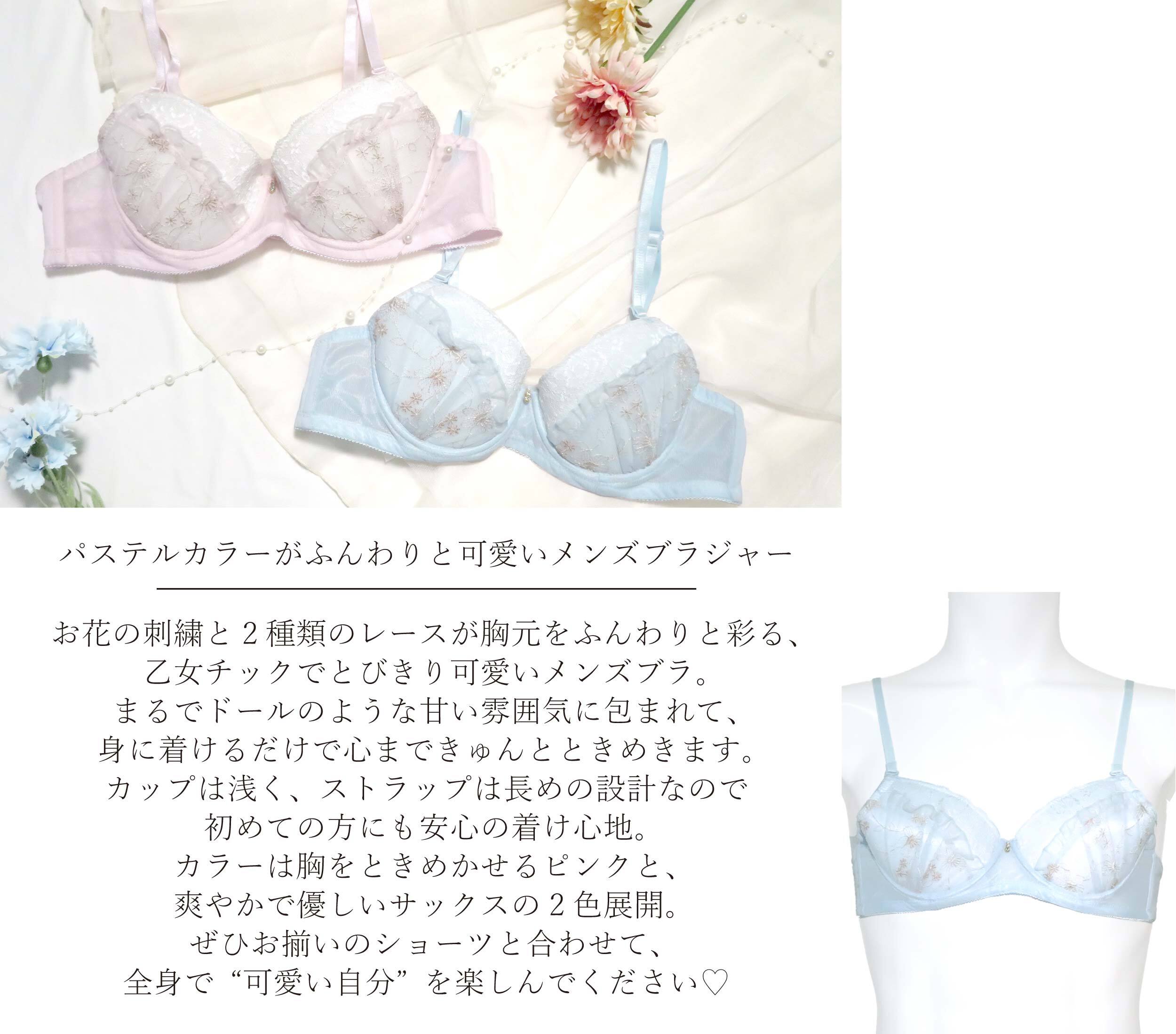 お花の刺繍と2種類のレースが重なり合い胸元をふんわりと彩る、乙女チックでとびきり可愛いメンズブラ。