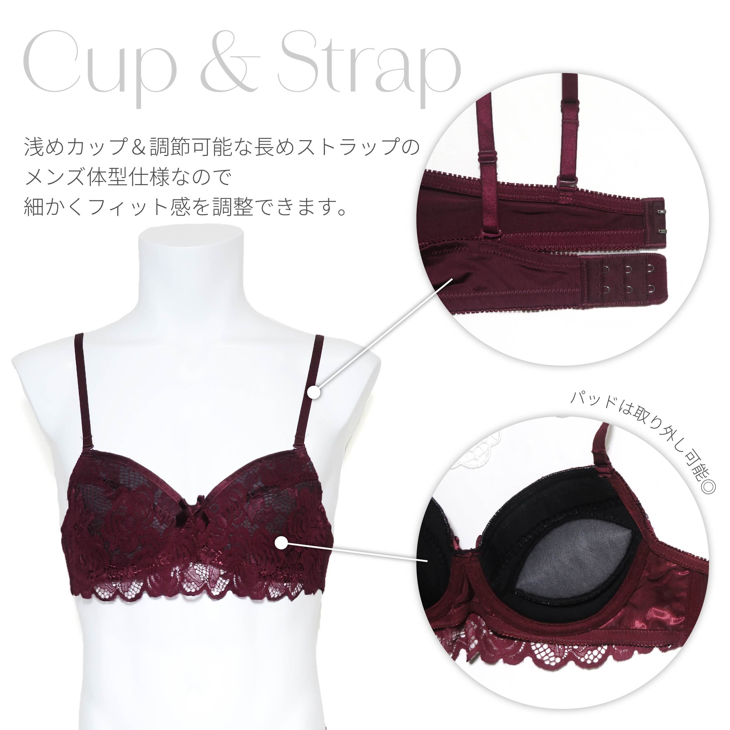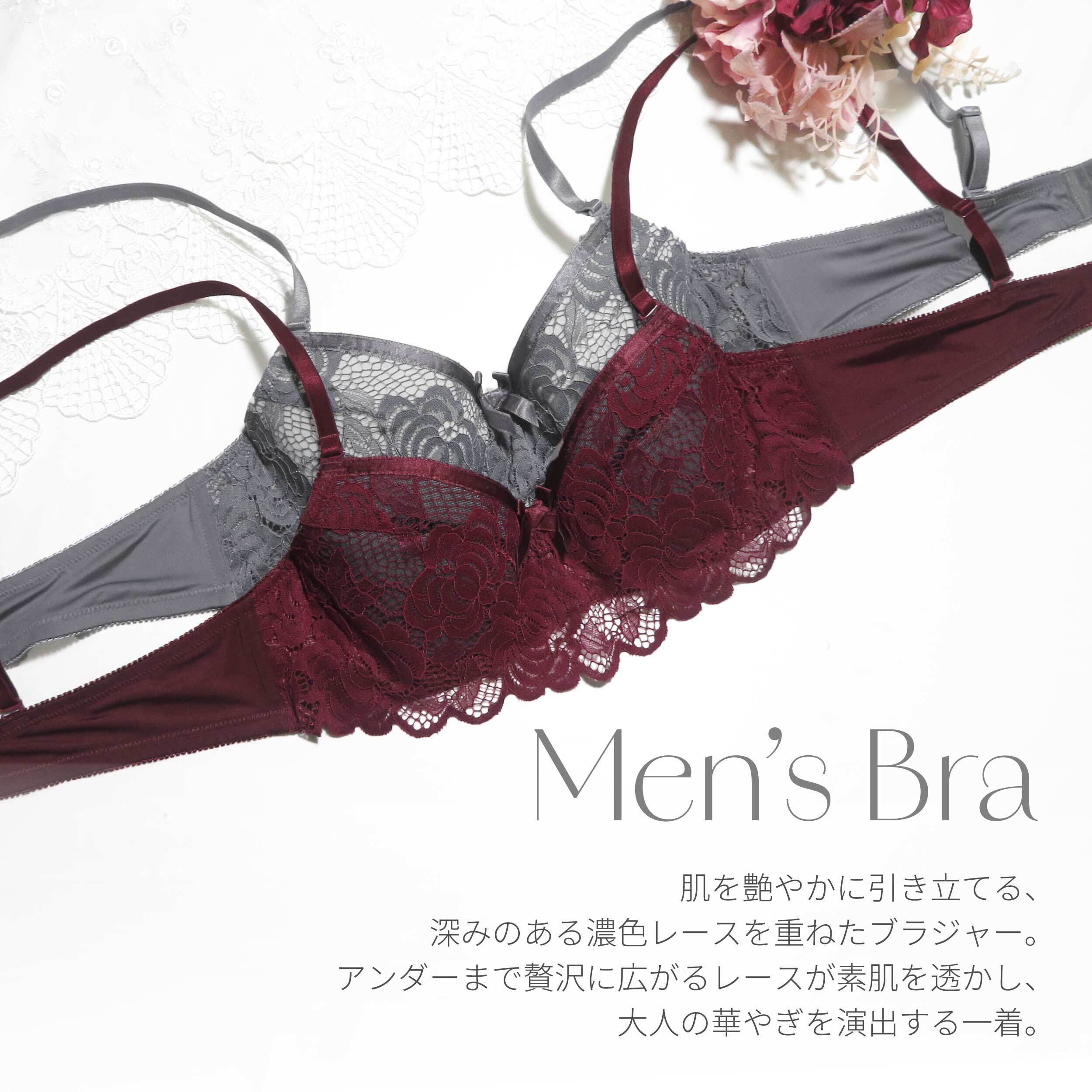肌を艶やかに引き立てる、深みのある濃色レースを重ねたメンズ用ブラジャーです。