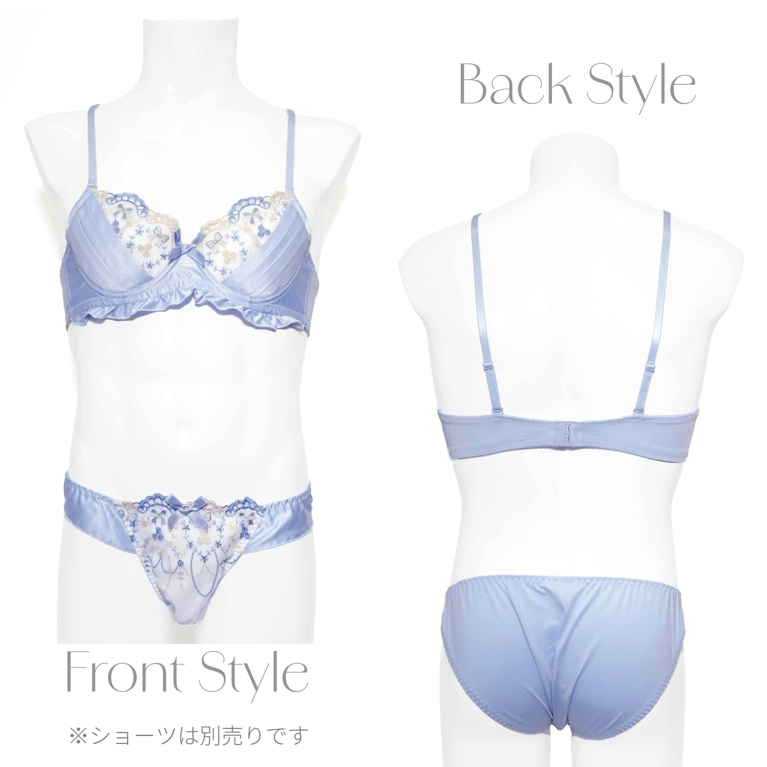 サテンの光沢と、繊細なラメ刺繍がフェミニンなデザインのメンズ用ブラジャーです。