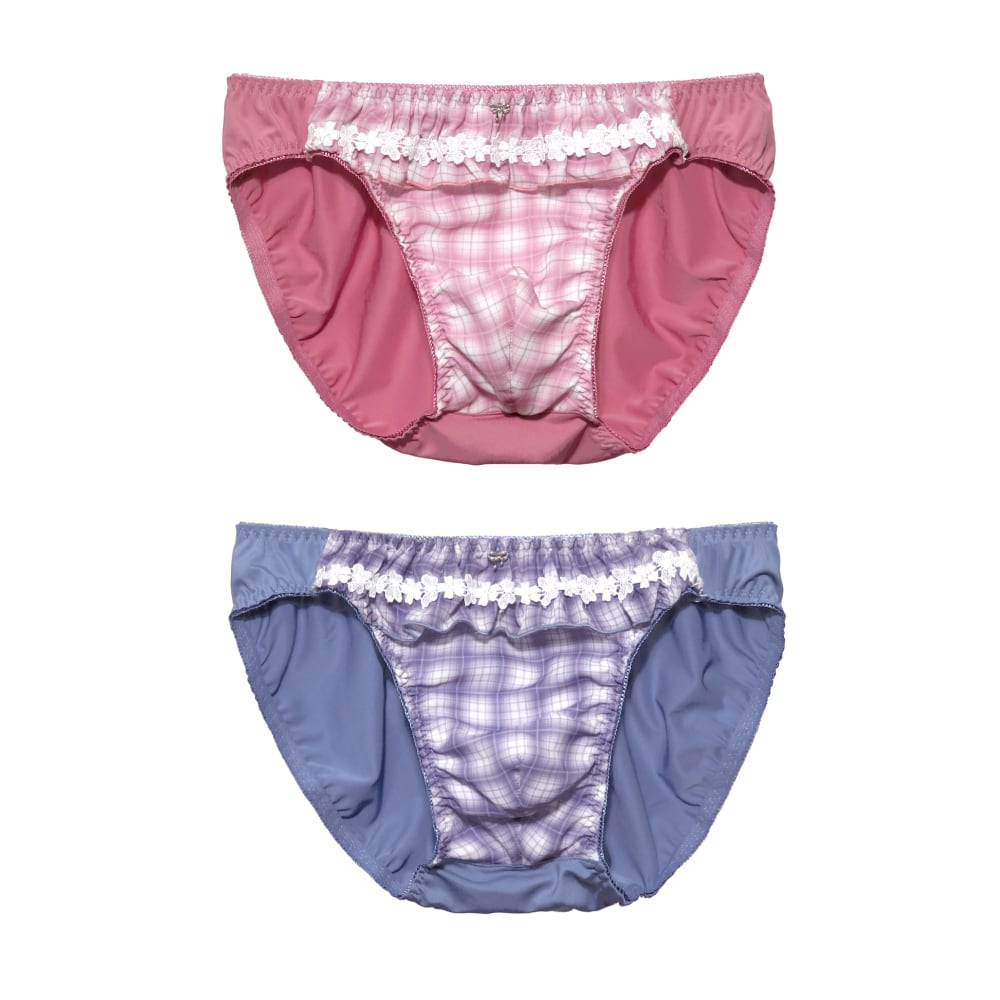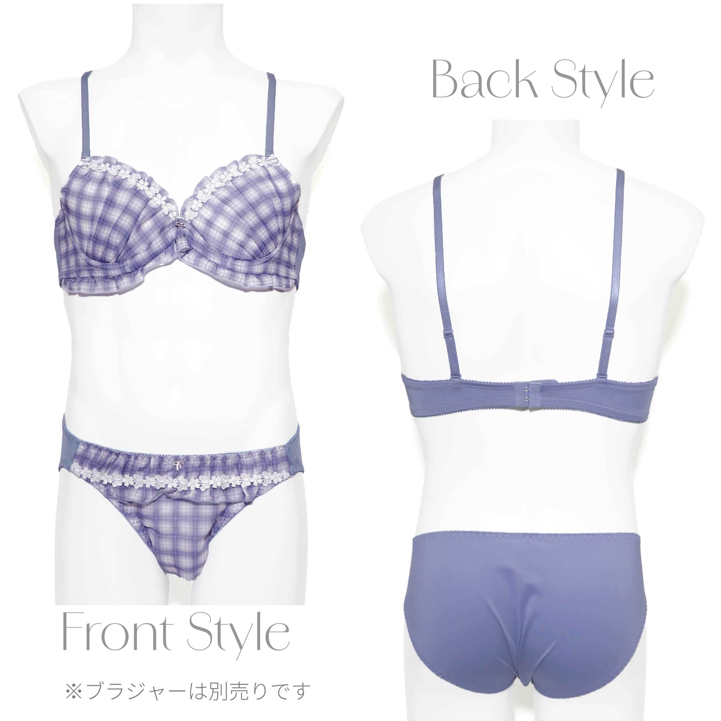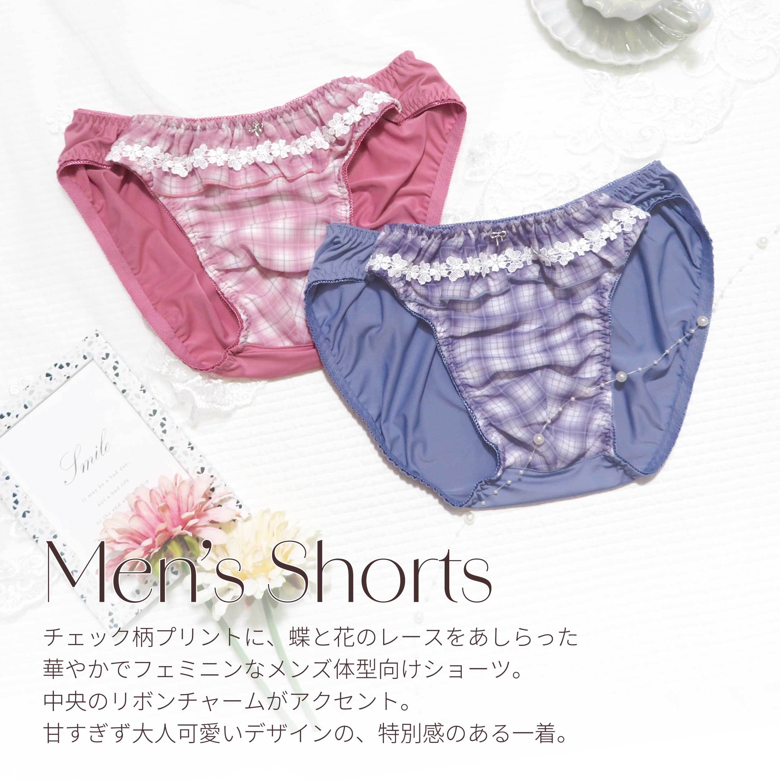 チェック柄プリントに、蝶と花のレースをあしらった華やかでフェミニンなデザインのメンズ用ショーツです。