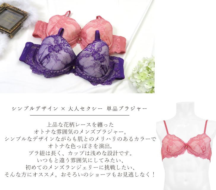 上品な花柄レースを纏ったオトナな雰囲気のメンズブラジャー。シンプルなデザインながらも肌とのメリハリのあるカラーでオトナな色っぽさを演出。ブラ紐は長く、カップは浅めな設計です。いつもと違う雰囲気にしてみたい、初めてのメンズランジェリーに挑戦したい、そんな方にオススメ。おそろいのショーツもお見逃しなく!