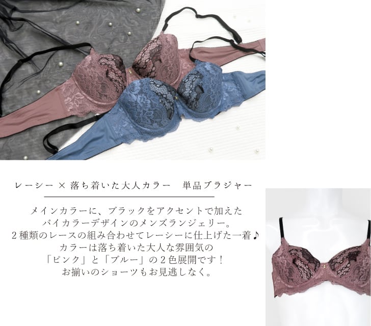 メインカラーに、ブラックをアクセントで加えたバイカラーデザインのメンズランジェリー。2種類のレースの組み合わせてレーシーに仕上げた一着♪カラーは落ち着いた大人な雰囲気の「ピンク」と「ブルー」の2色展開です!お揃いのショーツもお見逃しなく。